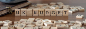 uk budget word or concept represented by wooden letter tiles on